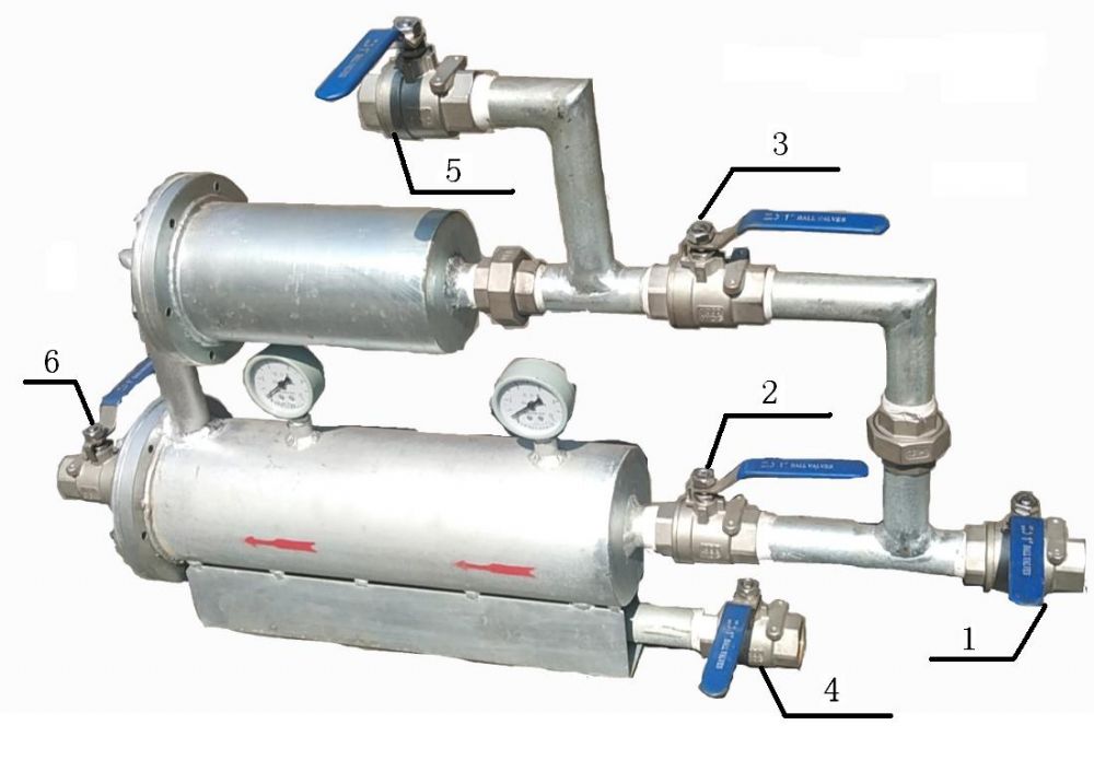 V、 主過濾器發(fā)生異常副過濾器正常工作:先后打開1、3號反沖洗閥門、6號出水口閥門;依次關(guān)閉2號進(jìn)水口閥門、5號副過濾器排污閥門、4號主過濾器排污閥門,水由原水管道直接進(jìn)入3號反沖洗閥門,經(jīng)過副過濾器過濾再由6號出水口閥門直接接入下一管道;副過濾器正常工作完成。